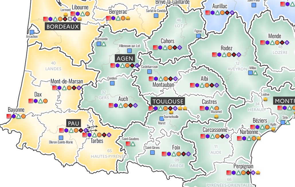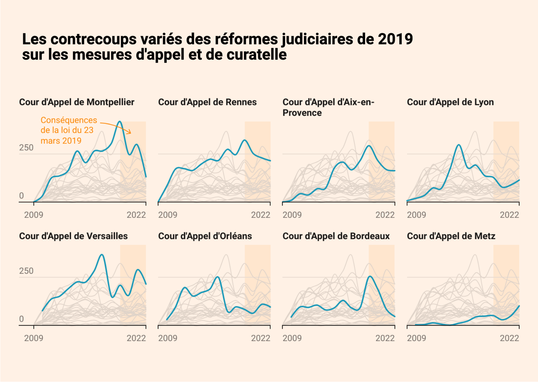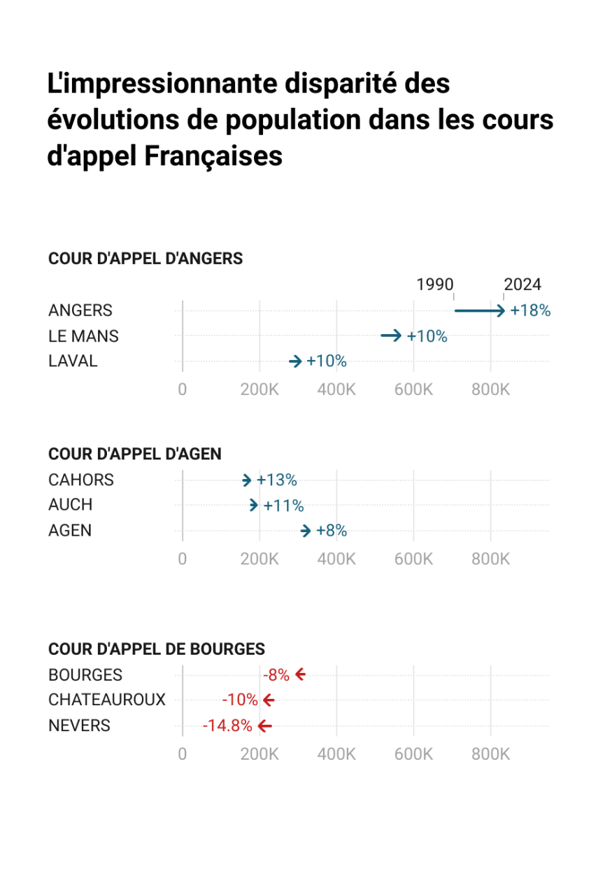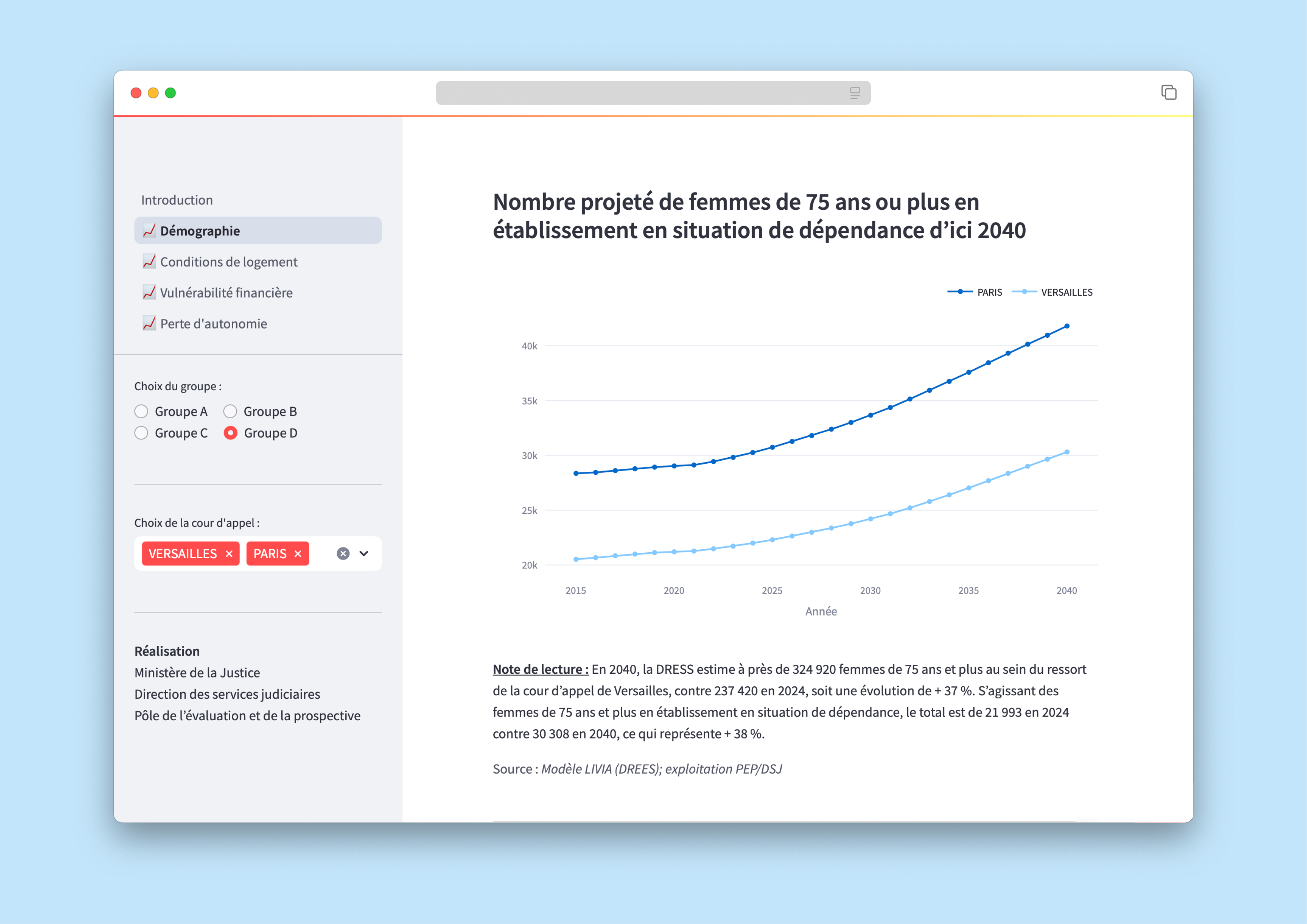 Réalisé dans le cadre de mon travail au Ministère de la Justice, le tableau de bord du vieillissement compile des données publiques à l'échelle des ressorts des cours d'appel sur le territoire français.